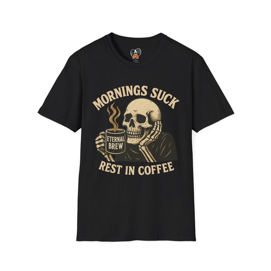Skull Coffee T-Shirt: Mornings Suck Design, Funny Unisex Tee for Coffee Lovers, Casual Wear, Gift for Friends